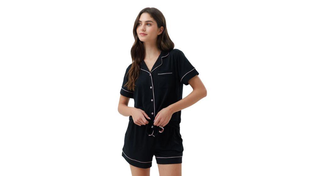 פיג'מה מכופתרת בעיצוב נשי ונקי, המשלבת חולצה עם כיס קדמי ומכנס קצר בגומי וקשירה קדמית להתאמה מדויקת לגוף