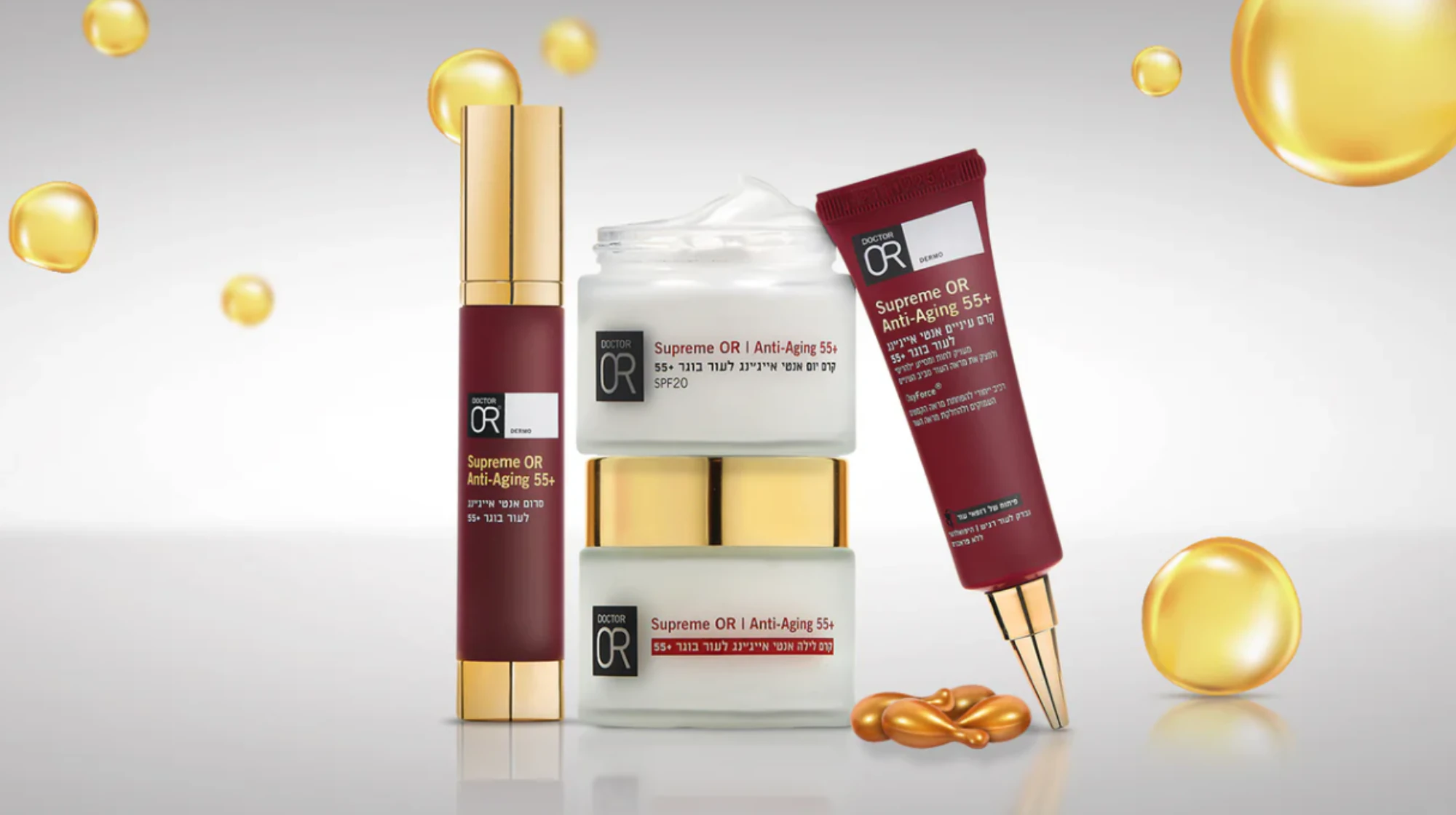 סדרת Supreme OR של ד״ר עור היא סדרת אנטי־אייג׳ינג מתקדמת המיועדת לעור בוגר (בעיקר 55+), שמטרתה לטפל בקמטים עמוקים, לשפר את מיצוק העור ולהעניק מראה חלק וצעיר יותר. הסדרה כוללת שגרת טיפוח מלאה כמו סרום, קרם יום, קרם לילה וקרם עיניים, ומבוססת על רכיב פטנט ייחודי (OxyForce) הפועל להפחתת מראה הקמטים ולהחלקת העור. המוצרים מעניקים לחות והזנה אינטנסיבית, מסייעים בחידוש העור ובהגברת הגמישות, ומתאימים לשימוש יומיומי כחלק מטיפול מקיף בעור בוגר.