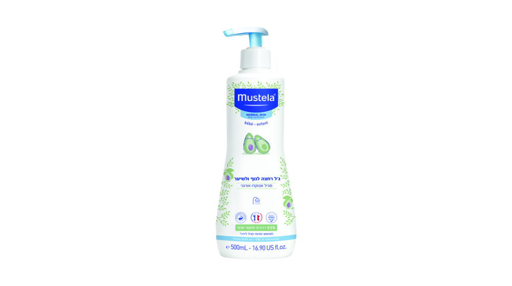 Mustela ג'ל רחצה לגוף ולשיער לתינוקות וילדים לעור רגיל. ג'ל רחצה מוסטלה מכיל 93% רכיבים ממקור טבעי ואת רכיב הפטנט Avocado Perseose