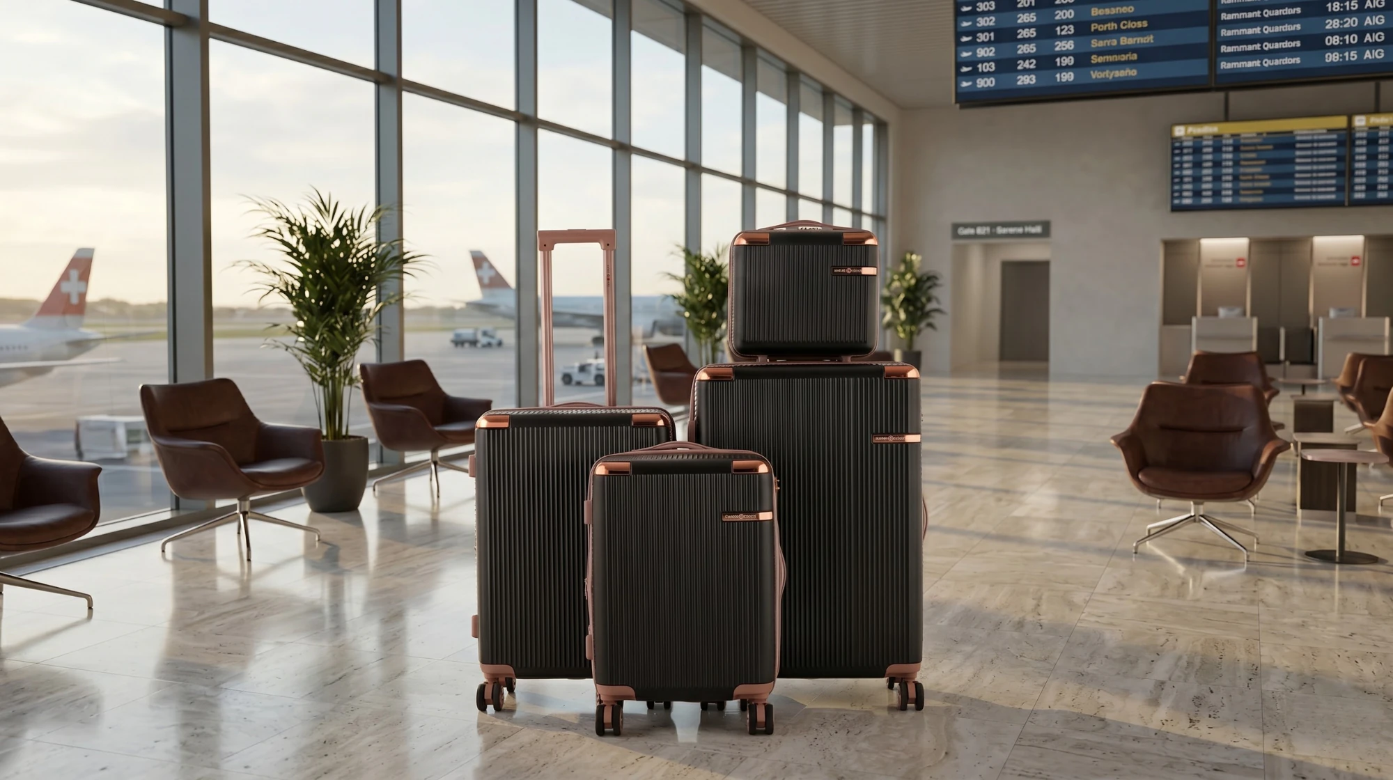 צבעים לבחירה: שמפנייה / רוז גולד / כחול נייבי / שחור. 4 מזוודות בגדלים: 30 | 26 | 20 אינץ' + תיק איפור.